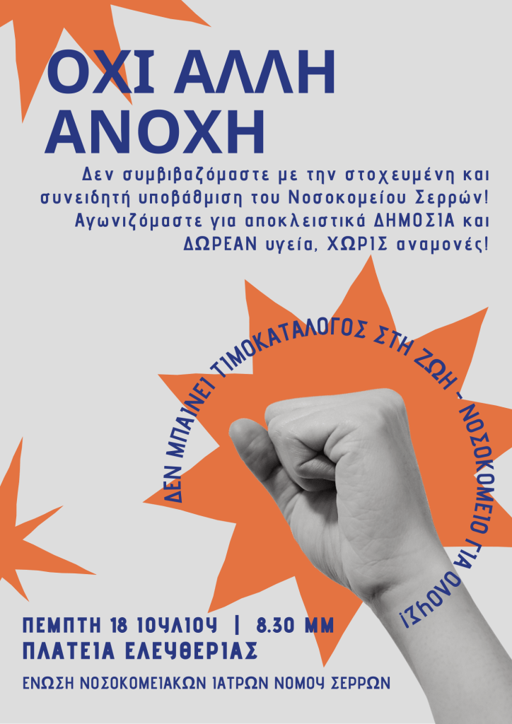 ΕΝΙΝΣ Ανακοίνωση – Κάλεσμα κινητοποίησης για το Νοσοκομείο Σερρών την Πέμπτη 18 Ιουλίου