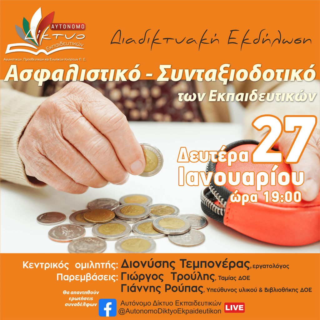 Το Αυτόνομο Δίκτυο Εκπαιδευτικών Π.Ε. σας προσκαλεί στην ανοιχτή διαδικτυακή εκδήλωση για το «Συνταξιοδοτικό-Ασφαλιστικό των εκπαιδευτικών».