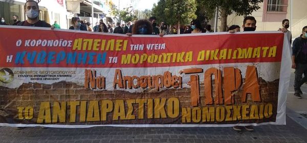 Ολοκληρώθηκε, πριν από λίγο, το μαζικό και δυναμικό πανεκπαιδευτικό συλλαλητήριο, που οργάνωσαν οι Σύλλογοι Εκπαιδευτικών Π.Ε. «Δ. Θεοτοκόπουλος», »Φαιστός», ΕΛΜΕ Ηρακλείου και φοιτητικοί σύλλογοι. Η πορεία κατάληξε στην Περιφερειακή Διεύθυνση Εκπαίδευσης Κρήτης, όπου πραγματοποιήθηκε συμβολική κατάληψη. Το κλίμα αυταρχισμού και τρομοκρατίας που επιδιώκει να επιβάλλει η κα. Κεραμέως δεν θα περάσει. Συνεχίζουμε τον αγώνα με Απεργία-Αποχή ενάντια στην ψευδεπίγραφη »αξιολόγηση»