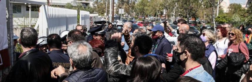 Τα ΜΑΤ «χτυπούσαν στο ψαχνό» – Συγκέντρωση διαμαρτυρίας εκπαιδευτικών εν αναμονή της παρουσίας του Κ. Μητσοτάκη στο Μέγαρο Μουσικής – Μία προσαγωγή Αναίτια και σφοδρή επίθεση των ΜΑΤ εναντίον εκπαιδευτικών, οι οποίοι πραγματοποιούσαν συγκέντρωση διαμαρτυρίας, έξω από το Μέγαρο Μουσικής, σημειώθηκε το απόγευμα της Δευτέρας, λίγο πριν την ομιλία του πρωθυπουργού σε εκδήλωση για την Παιδεία. Όπως μετέδωσε ο δημοσιογράφος της «Αυγής» και του ρ/σ στο Κόκκινο 105,5 Κώστας Παπαντωνίου, εκπαιδευτικοί, σπουδαστές