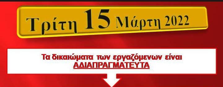 ΔΕΛΤΙΟ ΤΥΠΟΥ 24ωρη απεργία Δευτέρα 18 Ιούλη 2022 Μεταξύ αυτών των συνθηκών των όρων και των προϋποθέσεων ιδιωτικοποίησης της δημόσιας συγκοινωνίας είναι η κατάργηση και η εξάλειψη οποιουδήποτε εμπόδιου. Εμπόδιο για τους “επενδυτάς”- μαύρα κοράκια με νύχια γαμψά, αποτελούν οι εργατικές κατακτήσεις, τα δικαιώματα, μεταξύ των οποίων και οι μισθολογικές παροχές των εργαζόμενων. ΟΛΟΙ ΣΤΟ ΔΡΟΜΟ ΟΛΟΙ ΣΤΟΝ ΑΓΩΝΑ